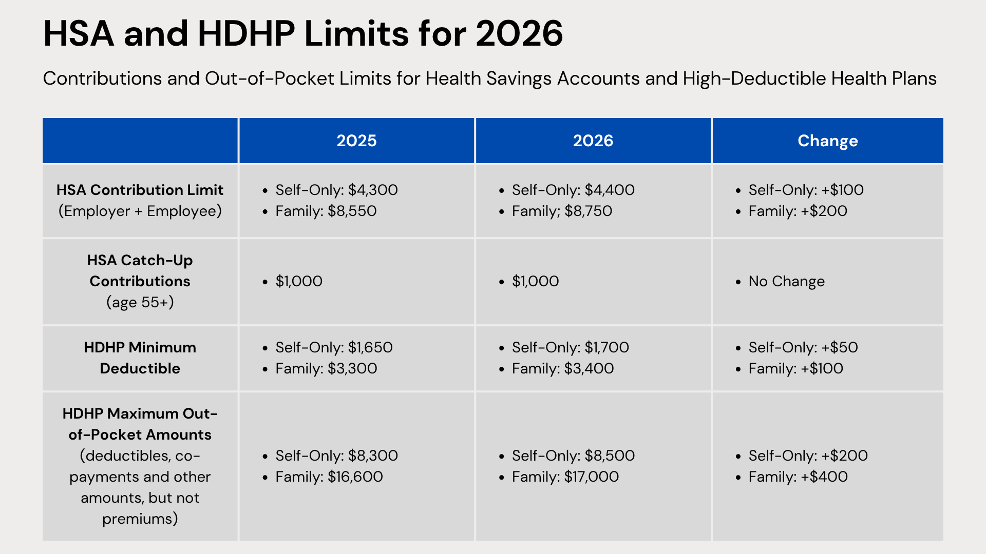 Graphic: The IRS annually adjusts limits for Health Savings Accounts (HSAs) and High Deductible Health Plans (HDHPs) based on inflation. This graphic details the 2026 limits and contrasts them with the 2025 figures.